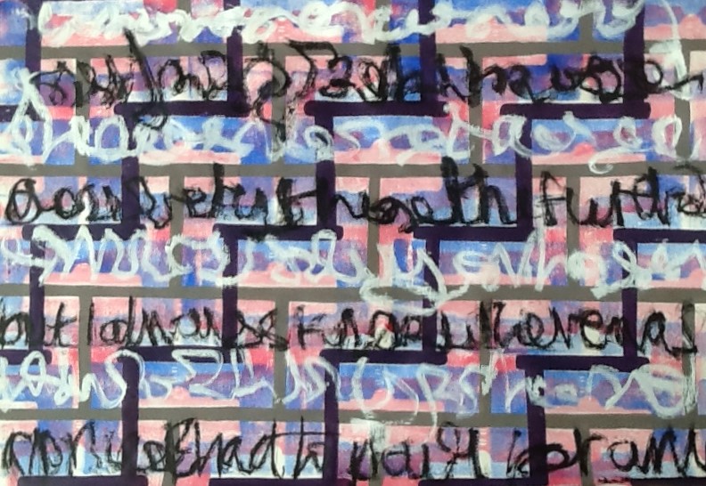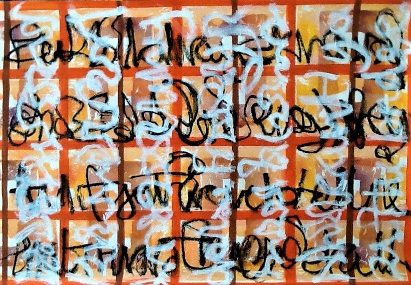 This is an amalgamation of the grid structure, which represents the institutional restraints that exist within a culture and the ‘natural’ act of asemic writing, full of physicality and emotional expression. Like graffiti, it emulates the word of ‘the street’ versus the word of ‘the establishment’: finance, business, the Law, etc