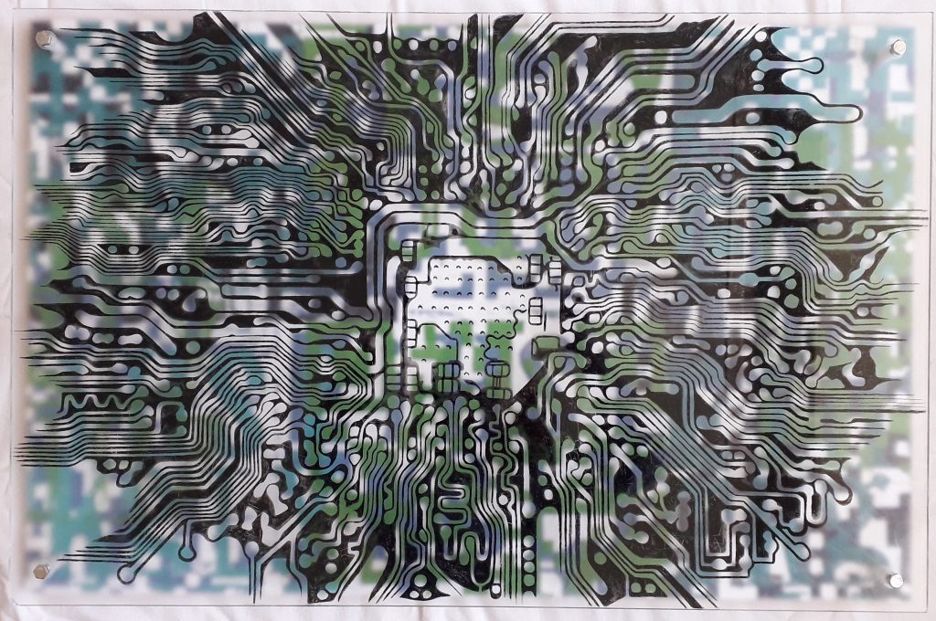 The process involved in creating this work required some technical assembly of parts which seems apt considering the subject nature of electronics and technology. My aim has been to capture the transparency of the medium and the way screens aspire to create a perfect illusion or copy of reality. The screen attempts to erase all traces of mediation between the visible text or image and the invisible physical components that engender it. Here, the interface is reversed in that the motherboard image is etched on to (the back of) the screen whereas the text or information code that normally resides before your eyes, lies half concealed beneath it.