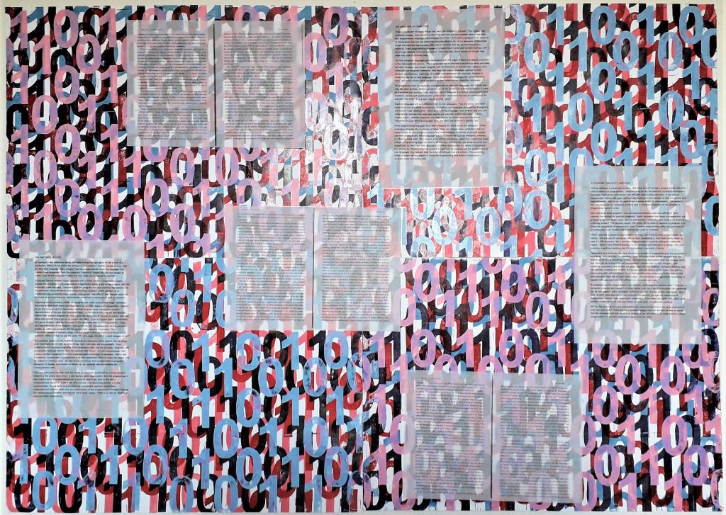 There are references in several aspects of the work. The background consists of a collage of monoprints produced using a linocut stencil; a reference to the method employed to create text in the age of the printed book. It refers to the fact that 1s and 0s are only a representation of the binary on/off switches of electric current that operate a computer. But in the multi-layered arrangement, there is no perspective; they are all the same size. The rows and columns line up but the colour combinations exist in a different order in each print, which produces the mesmerizing effect. This is an allusion to the fact that in processing, the data remains the same individual units and it is the algorithm applied to it that changes the context.