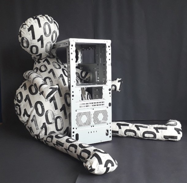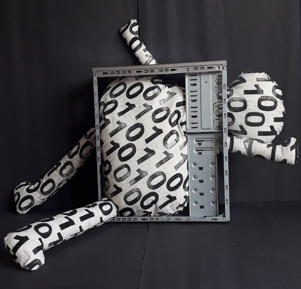 This work is intended to be a collection of 12 photographs of the doll in different positions in and outside a computer tower, with captions to highlight the many occupations and activities that now take place using this piece of technology and the range of emotions we experience as we engage. Other options are: e-mailing relatives, job applications, suicide chatrooms, pornography, social media like Facebook, streaming films and TV, internet shopping and googling information ad many, many, more. It has become a ubiquitous piece of machinery encompassing business, entertainment, communication and self-regulation. We are powerless to function without it.