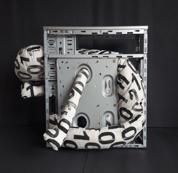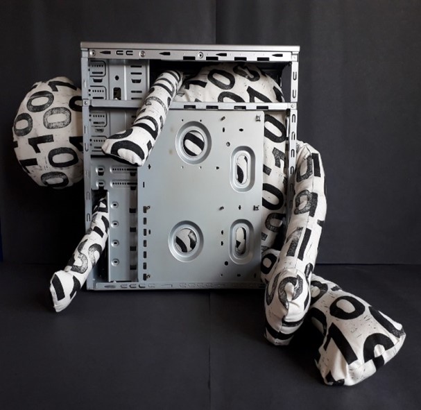 The doll in this piece is deliberately ‘faceless’, in the same way as we can interact on line; without gender, age or race. It highlights the fact that in the virtual world, we can be anonymous and ‘free’. The ‘softness’ of the medium reflects the juxtaposition of the natural world and the body with the ‘hard’ metallic world of computer technology. It emphasises the vulnerability of the body and its ability to ‘feel’. There are all sorts of dualistic hierarchies going on here that weave in and out of our unconscious awareness. These oppositions of mind and body, thinking and emotion, gendered bodies and racial bodies are all addressed with a hybrid figure in a surreal environment.