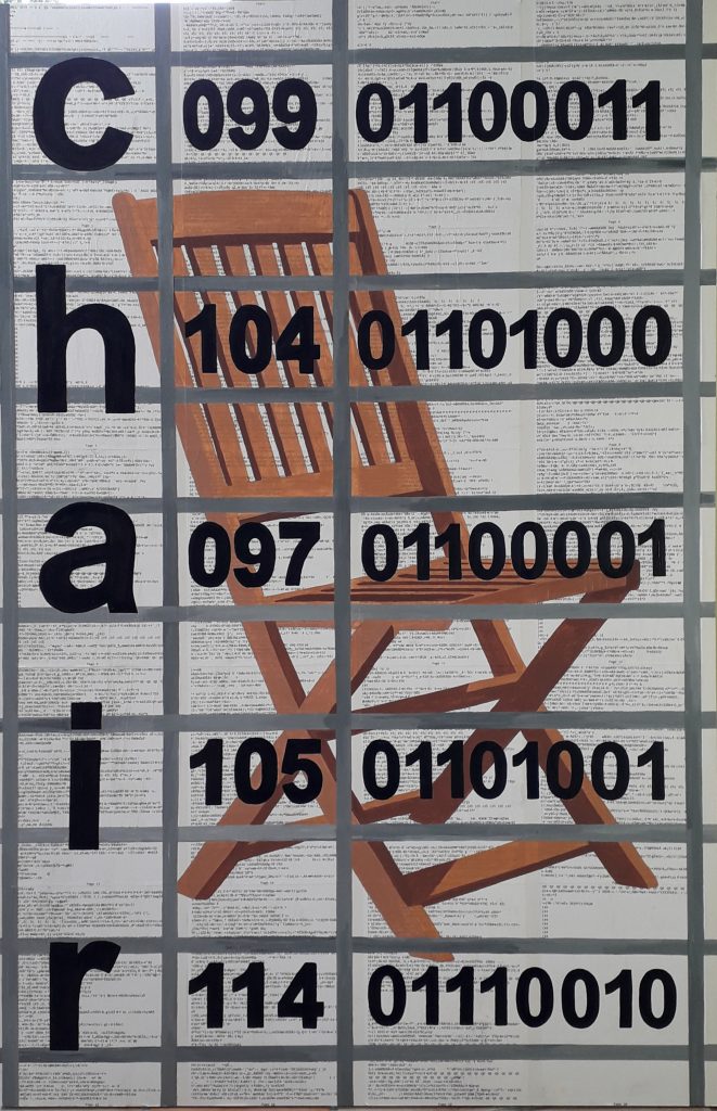 My aim is to represent the layers of reference in the modern production of photographs and text on a computer. The background consists of the file data viewed through the text editor, notepad++, for a jpeg image of a chair, found on a website page on line. In order for the computer to process this, this language is in turn translated or converted into machine code or binary by a compiler. The forefront is the ASCII code for each individual letter of the word ‘chair’; these too have to be compiled in binary for the computer to process it. It is significant that these two sign systems, images and text, which have been separated for centuries by their modes of production, are now reunited in the same basic medium. Pixels and characters are the same in the language of computer code.