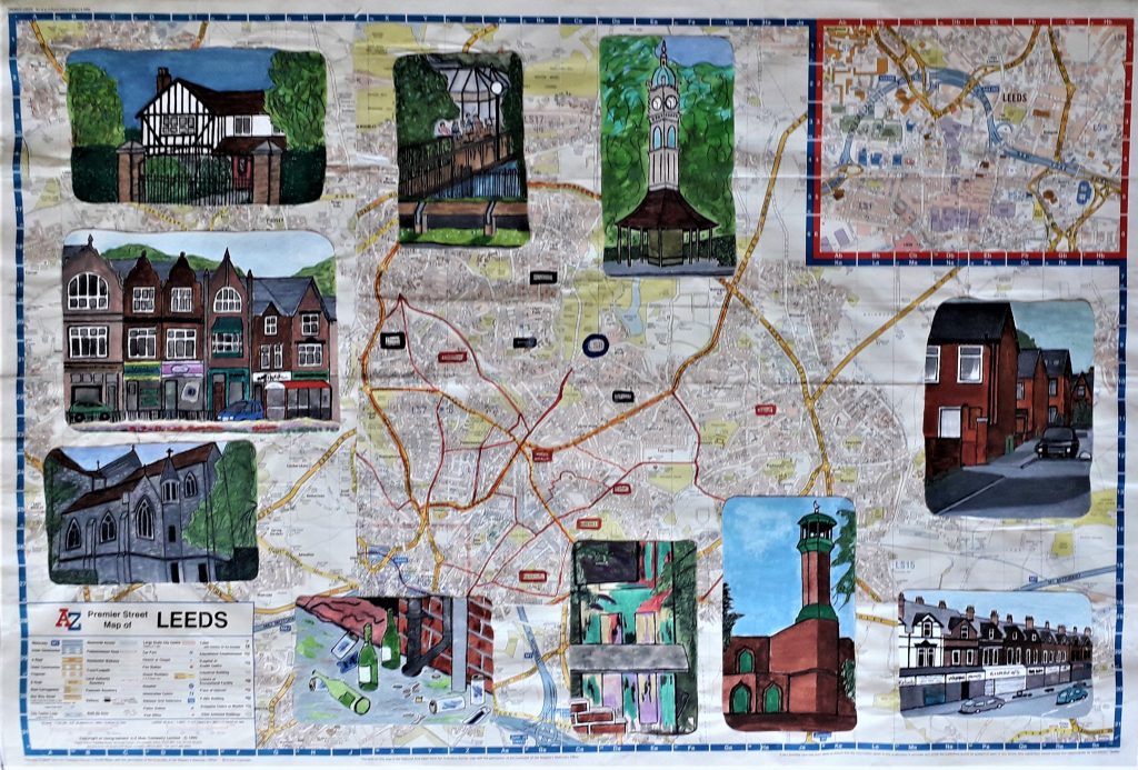 This is about the inequality at either end of a particular main road in Leeds. At one end of Roundhay Road the terraced houses cost about £50,000 and at the other end mansions are worth more than £500,000. The images of local landmarks show the difference in the standard of living, despite having the same postcode.