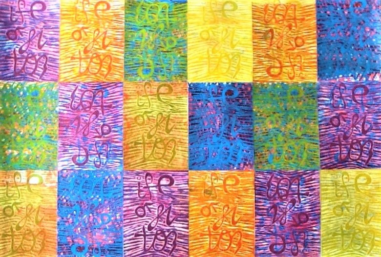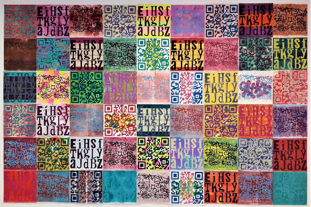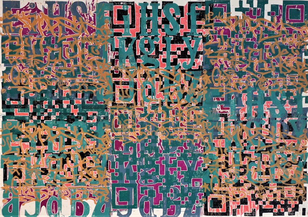 This work is designed to combine the three chronological elements of written language (gestural hand writing, printed text and machine-read code), accentuating their form and pattern and divorced from their semiotic function of communication. Digitalisation reduces all texts to the same format as ‘patterns’ in code. In these prints, the ‘language’ is obliterated by the overlapping shapes and the patches of colour. They are each, just an ‘abstract image’, a colourful repetitive pattern, like code. The spaces between the characters have been filled with black and coloured ink to represent the dark screen of a computer that comes to life with symbols and colour when it is switched on.