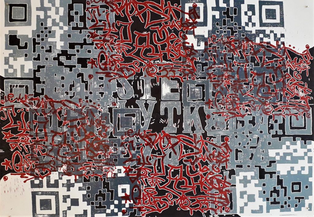 Layered linocut prints emulate the design of hypermedia where layers of text, image, film, animation and sound are all employed to create a more immediate and authentic experience than traditional media like books. But the bolder, more impressive, eye-catching result is just sophisticated technology; a simulation of the ‘real’ and far more effective at manipulation and control in terms of advertising or social media. Computers even imitate other forms of media in producing representations and are the epitome of the postmodern world.