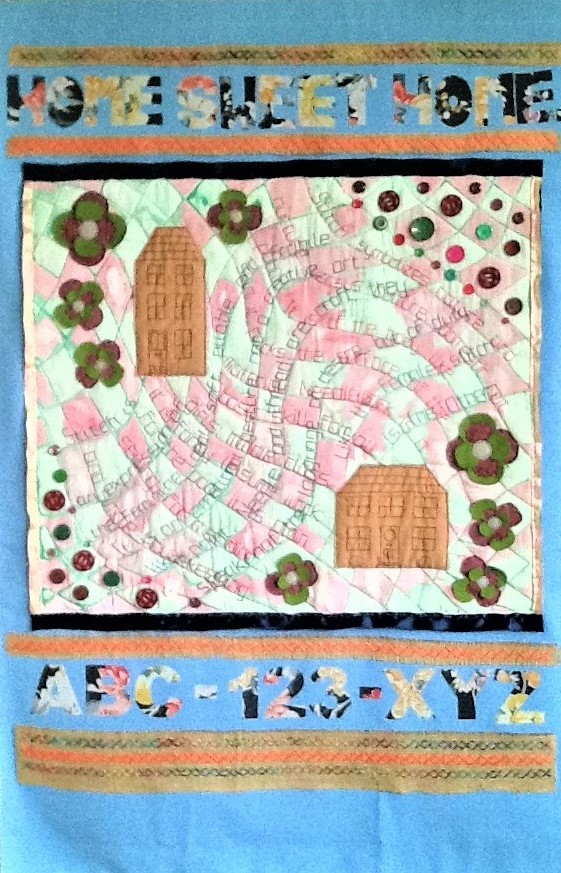 Stitching maintains a primitive flow like drawing or handwriting.  It is a medium which allows for the conjunction of text and image and allows the build-up of layers, like collage.  It also has a physicality and unlike painting, shares an intimate union with the fabric as the stitches break through the surface like skin.