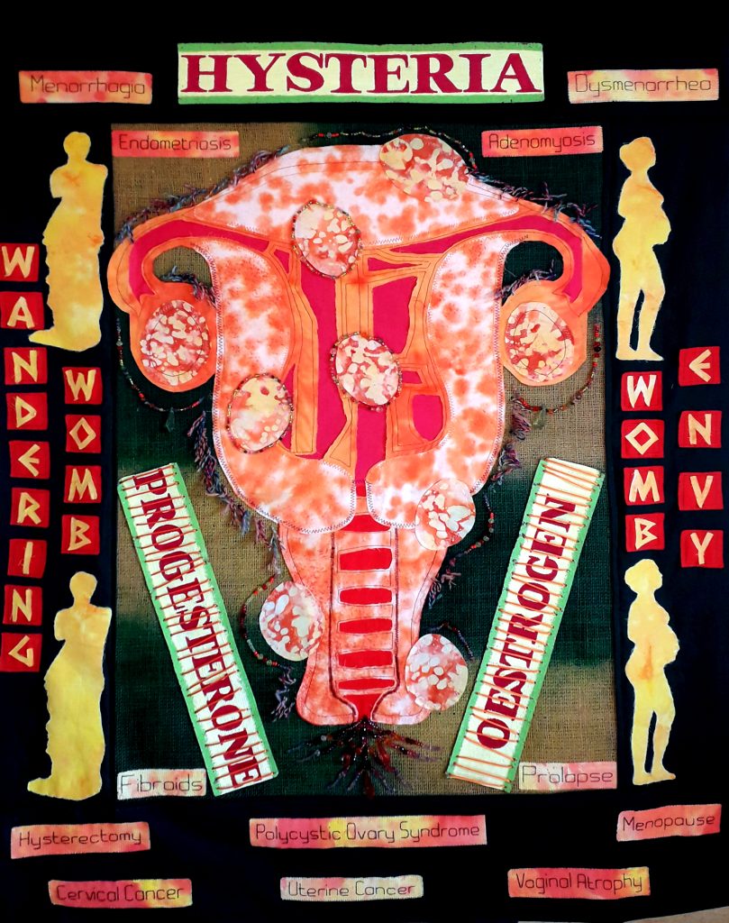 The diagram bears a striking resemblance in form to the iconic image of the Crucifixion and so the arrangement of the elements is designed to look like a figure on a cross.  Jesus, according to religious theory, died for our sins, but for women, the weight of sin was transferred to the properties of this part of their anatomy with its temptations for copulation, periodic bleeding, site of disease and childbirth.  It stimulates the fluid leakages and miasma which subjected women to notions of impurity and banishment from the church in the past.  Christ’s passion was exalted; but the passion of women was deemed immoral and swathed in feelings of fear and loathing.  It represents men’s desire to control the womb as an expression of their envy of its power.